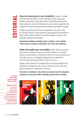 Faça do nosso guia o seu cúmplice, “aquele” amigo que lhe dá boas dicas, tenha-o sempre à mão, seja para decidir onde jantar, seja para saber a morada da farmácia mais próxima. E que tal inspirar-se nas nossas sugestões de shopping? Temos dezenas de boas ideias a partilhar consigo. Adopte uma atitude de frescura perante o seu dia-a-dia na cidade, faça de cada momento uma pequena descoberta. Seja curioso, atento, olhe à sua volta. Pegue no guia e leve consigo o nosso entusiasmo. Queremos festejar consigo, hoje e sempre, uma cidade onde nunca se perde a sensação de se ser um viajante.