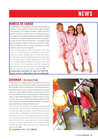 GUIoMAR · TM Collection A TM Collection chega à capital numa parceria com a loja de decoração e flores Guiomar. Sedas orientais, palhinhas envelhecidas, texturas deslizantes, combinações de tecidos fascinantes, é assim que Teresa Martins nos surpreende com cada colecção. Nesta concept store convivem as linhas Fashion e Home realçadas pelo cinzento das paredes, o desnivelado dos pisos, a dinâmica das montras, a mistura das cores e brilhos dos vestidos, faixas e outras tantas peças de roupa que apetece amontoar no provador para experimentar, levar para casa e usar! TM Collection has arrived in the capital via a partnership with Guiomar, the home decor and flower shop. With her oriental silks, aged straw hats, smooth textures and fascinating fabric combinations, Teresa Martins surprises with every collection. This concept store stocks the Fashion and Home collections, which are set off by the grey walls, different floor levels, dynamic window displays, mixture of colours and shimmer of the dresses, sashes and the many other items you can’t resist trying on, buying and using! RT 1D
