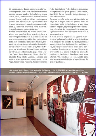 Pedro Cabrita Reis, Pedro Calapez , bem como os representados pela galeria, Uwe Lindau, Axel Heil, Carlos Henrich, Nelson Cardoso e Shintaro Nakaoka. Como se percebe após uma visita guiada ao longo da colecção, a relação pessoal entre as galeristas e cada peça obriga-as a que, para além do negócio, se preocupem com o seu futuro e localização, empenhando-se para que sejam adquiridas para colecções criteriosas e amantes da arte. A mais recente exposição da galeria “Confrontos”, pela curadora Rajele Jain, simbolizou bem o espírito e a filosofia das duas galeristas. A combinação de trabalhos de épocas diferentes, as relações inesperadas entre obras conceituadas, demonstraram um espírito aberto, irreverente, mas acima de tudo um profundo e sólido conhecimento das obras e dos seus artistas. Um resultado só conseguido com uma enorme sensibilidade e ingredientes de grande qualidade.•
