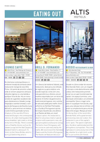 Situado no último andar do recente Altis Avenida Hotel, com um magnífico terraço e vista deslumbrante sobre Lisboa, este restaurante promete tornar-se um spot incontornável da capital. Um espaço luminoso, uma decoração sofisticada e um ambiente cosmopolita. Este é o lugar certo para vir a qualquer hora do dia, seja para uma refeição leve ao almoço, um jantar ou simplesmente para uma bebida entre amigos. Marque já mesa! On the top floor of the recent Altis Avenida Hotel, with a great terrace and stunning view over Lisbon, this restaurant is one of the capital’s iconic spots. The space is light and airy, the décor sophisticated and the atmosphere cosmopolitan. This is the right place to come at any time of the day, whether for a light lunch, a dinner or just a drink with friends. con vida LIBERDADE · 23