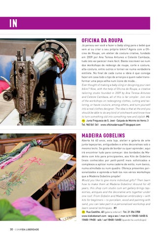 IN Oficina da Roupa Já pensou ser você a fazer o baby sling para o bebé que vem aí ou criar o seu próprio bikini? Agora com a Oficina de Roupa, um atelier de costura criativa, fundado em 2009 por Ana Teresa Antunes e Celeste Cambaza, tudo isto vai parecer mais fácil. Basta inscrever-se num dos workshops de redesign de roupa, corte e costura, alta-costura, entre outros e tornar-se numa verdadeira estilista. No final de cada curso a ideia é que consiga fazer em casa todo o tipo de arranjos e quem sabe transformar uma peça velha num ícone de moda... Ever thought of making a baby sling or designing your own bikini? Now, with the help of Oficina de Roupa, a creative tailoring studio founded in 2009 by Ana Teresa Antunes and Celeste Cambaza, all of this is far simpler. Join one of the workshops on redesigning clothes, cutting and tailoring, or haute couture, among others, and turn yourself into a real clothes designer. The idea is that at the end you should be able to do any kind of stitchwork and know how to turn something old into something new and stylish. PS 7G