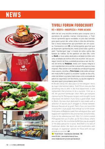 NEWS TIVOLI FORUM FOODCOURT H3 + BEEFS + MADPIZZA + PURO ACASO Além de ser uma escolha certeira para compras com a assinatura de grandes marcas internacionais, o Tivoli Fórum apresenta agora novidades no piso das comidas para quem quiser dar umas voltas à roda dos alimentos. São 4 novos restaurantes que prometem ser um sucesso. Começamos com H3, os hambúrgueres gourmet que já dispensam apresentações, tendo posto toda a gente a pedir “hambúrguer tuga” e trazido de volta a glória das batatas às rodelas. Se lhe apetecer um belo bife, rume ao Beefs, a nova cadeia dedicada a verdadeiros bifes com uma variedade de molhos difícil de escolher. Isto se conseguir resistir às finas e estaladiças pizzas a sair dos fornos de lenha da Madpizza, feitas com massa integral e com ingredientes como pinhão e alcachofra, para os mais originais. Mas estiver com vontade de comida portuguesa mais caseira, escolha o Puro Acaso, onde pode almoçar em modo buffet (a peso) ou escolher o prato do dia a E4, onde não faltam os pratos tradicionais como a empada de pato e os cogumelos com farinheira, ou opções vegetarianas para quem já se prepara para o Verão. > Besides being the ideal place to find designer items by major international labels, Tivoli Fórum now also has something new to offer in the food department: 4 new restaurants that promise to be a success. First up is H3, the gourmet hamburger chain that’s got everyone clamouring for Portuguese burgers and brought round chips back into fashion. If you fancy a good steak, head to Beefs, the new chain dedicated to real steaks with a selection of sauces you’ll struggle to choose between because they are all so good. That’s if you can resist the crunchy thin-crust pizzas that emerge out of the woodfired ovens at Madpizza made from wholegrain flour and topped with ingredients like pine kernels and artichoke, if you’re the adventurous sort. But if it’s home-cooked Portuguese fare you’re after, go for Puro Acaso, where you can opt for the lunchtime buffet (you pay by weight) or the daily special for 4 euros. And there is no lack of traditional dishes like duck pie and mushrooms with sausage, or vegetarian options for those with one eye already on summer. MP 5G