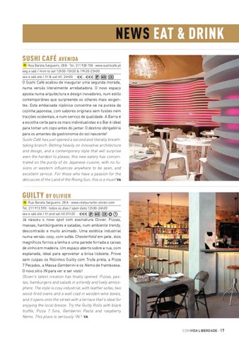 Já nasceu o novo spot com assinatura Olivier. Pizzas, massas, hambúrgueres e saladas, num ambiente trendy, descontraído e muito animado. Uma estética industrial numa versão cosy, com sofás Chesterfield em pele, dois magníficos fornos a lenha e uma parede forrada a caixas de vinho em madeira. Um espaço aberto sobre a rua, com esplanada, ideal para aproveitar a brisa lisboeta. Prove sem culpas os Rolinhos Guilty com Trufa preta, a Pizza 7 Pecados, a Massa Gamberini e os Nems de framboesa. O novo sítio IN para ver e ser visto! Olivier’s latest creation has finally opened. Pizzas, pastas, hamburgers and salads in a trendy and lively atmosphere. The style is cosy industrial, with leather sofas, two wood-fired ovens and a wall clad in wooden wine boxes, and it opens onto the street with a terrace that’s ideal for enjoying the local breeze. Try the Guilty Rolls with black truffle, Pizza 7 Sins, Gamberini Pasta and raspberry Nems. This place is seriously ‘IN’! VA CON VIDA LIBERDADE · 17
