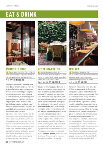 Com pouco mais de 6 meses e pela mão dos jovens Chefs Diogo Noronha e Nuno Bergonse, este restaurante tornou-se um valor seguro na gastronomia contemporânea lisboeta. A carta é sazonal, elaborada a partir dos produtos do mercado e o Menu degustação, com 6 pratos, é uma perdição para quem gosta de experienciar sabores variados. Cozinha de qualidade e inovadora num ambiente contemporâneo e sóbrio. Opened a little over 6 months ago by the young chefs Diogo Noronha and Nuno Bergonse, this restaurant has already become a reference point on Lisbon’s contemporary cuisine scene. The à la carte menu is based on seasonal fare, while the tasting menu consists of 6 divine dishes for anyone who enjoys a mixture of flavours. Quality and innovative cooking in a modern and discreet setting. 20 · CON VIDA LIBERDADE