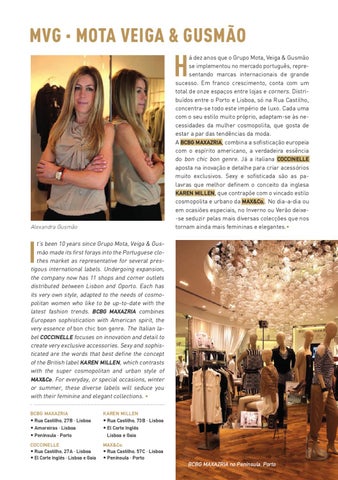 á dez anos que o Grupo Mota, Veiga & Gusmão se implementou no mercado português, representando marcas internacionais de grande sucesso. Em franco crescimento, conta com um total de onze espaços entre lojas e corners. Distribuídos entre o Porto e Lisboa, só na Rua Castilho, concentra-se todo este império de luxo. Cada uma com o seu estilo muito próprio, adaptam-se às necessidades da mulher cosmopolita, que gosta de estar a par das tendências da moda. A BCBG MAXAZRIA, combina a sofisticação europeia com o espírito americano, a verdadeira essência do bon chic bon genre. Já a italiana COCCINELLE aposta na inovação e detalhe para criar acessórios muito exclusivos. Sexy e sofisticada são as palavras que melhor definem o conceito da inglesa KAREN MILLEN, que contrapõe com o vincado estilo cosmopolita e urbano da MAX&Co.. No dia-a-dia ou em ocasiões especiais, no Inverno ou Verão deixe-se seduzir pelas mais diversas colecções que nos tornam ainda mais femininas e elegantes.•
