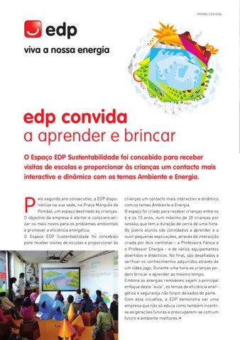 crianças um contacto mais interactivo e dinâmico com os temas Ambiente e Energia. O espaço foi criado para receber crianças entre os 6 e os 10 anos, num máximo de 20 crianças por sessão, que tem a duração de cerca de uma hora. Os jovens alunos são convidados a aprender e a ouvir pequenas explicações, através da interacção criada por dois cientistas – a Professora Faísca e o Professor Energia - e de vários equipamentos divertidos e didácticos. No final, são desafiados a verificar os conhecimentos adquiridos através de um vídeo jogo. Durante uma hora as crianças podem brincar e aprender ao mesmo tempo. Embora as energias renováveis sejam o principal enfoque desta “aula”, os temas de eficiência energética e segurança não foram deixados de parte. Com esta iniciativa, a EDP demonstra ser uma empresa que não só educa como também incentiva as gerações futuras a preocuparem-se com um futuro e ambiente melhores.•