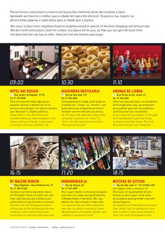 Percorremos Lisboa bairro a bairro em busca das melhores dicas de compras e lazer. Aproveite ao máximo o melhor que a cidade tem para lhe oferecer. Vá para a rua, inspire-se, devore estas páginas e salte delas para a cidade que o espera. We scour Lisbon from neighbourhood to neighbourhood in search of the best shopping and leisure tips. We do it with enthusiasm, both for Lisbon, but above all for you, so that you can get the most from the best that the city has to offer. Head off into the streets and enjoy!