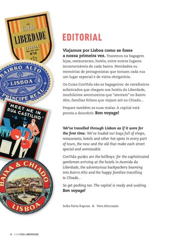 EDITORIAL Viajamos por Lisboa como se fosse a nossa primeira vez. Trazemos na bagagem lojas, restaurantes, hotéis, entre outros lugares incontornáveis de cada bairro. Novidades ou memórias de protagonistas que tornam cada rua um lugar especial e de visita obrigatória. Os Guias ConVida são os bagageiros: de cavalheiros sofisticados que chegam aos hotéis da Liberdade, mochileiros aventureiros que “aterram” no Bairro Alto, famílias felizes que viajam até ao Chiado... Prepare também as suas malas. A capital está pronta a descobrir. Bon voyage!
