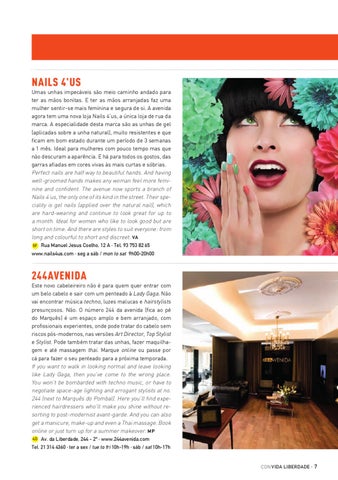 NEWS NAILS 4'US Umas unhas impecáveis são meio caminho andado para ter as mãos bonitas. E ter as mãos arranjadas faz uma mulher sentir-se mais feminina e segura de si. A avenida agora tem uma nova loja Nails 4’us, a única loja de rua da marca. A especialidade desta marca são as unhas de gel (aplicadas sobre a unha natural), muito resistentes e que ficam em bom estado durante um período de 3 semanas a 1 mês. Ideal para mulheres com pouco tempo mas que não descuram a aparência. E há para todos os gostos, das garras afiadas em cores vivas às mais curtas e sóbrias. Perfect nails are half way to beautiful hands. And having well-groomed hands makes any woman feel more feminine and confident. The avenue now sports a branch of Nails 4’us, the only one of its kind in the street. Their speciality is gel nails (applied over the natural nail), which are hard-wearing and continue to look great for up to a month. Ideal for women who like to look good but are short on time. And there are styles to suit everyone: from long and colourful to short and discreet. VA 5F