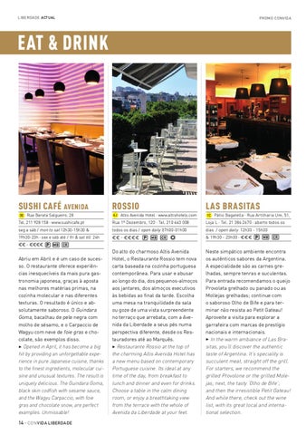 Abriu em Abril e é um caso de sucesso. O restaurante oferece experiências inesquecíveis da mais pura gastronomia japonesa, graças à aposta nas melhores matérias primas, na cozinha molecular e nas diferentes texturas. O resultado é único e absolutamente saboroso. O Guindara Goma, bacalhau de pele negra com molho de sésamo, e o Carpaccio de Wagyu com neve de foie gras e chocolate, são exemplos disso. 3 Opened in April, it has become a big hit by providing an unforgettable experience in pure Japanese cuisine, thanks to the finest ingredients, molecular cuisine and unusual textures. The result is uniquely delicious. The Guindara Goma, black skin codfish with sesame sauce, and the Wagyu Carpaccio, with foie gras and chocolate snow, are perfect examples. Unmissable! 14 · CON VIDA LIBERDADE