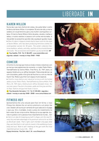 FITNESS HUT Apresentamos-lhe uma solução para ficar em forma: o novo Fitness Hut oferece-lhe um serviço premium a um preço low cost. Desde 6,60 euros por semana em que cada sócio só paga o que usa. Sim, é verdade, é este o preço do investimento no bem-estar do seu corpo e alma. Marque já na sua agenda: reunião no ginásio com a pessoa mais importante do mundo... EU! 3 Here’s an idea for keeping yourself in shape: join the new Fitness Hut and take advantage of its premium service for as little as €6.60 per week. That’s right, each member only pays what they use! And that’s it all costs to invest in the wellbeing of your body and soul. Note to self: meeting at the gym with the most important person in your life... YOU! Espaço Amoreiras · Rua Dom João V, 24 · www.fitnesshut.pt CON VIDA LIBERDADE · 23