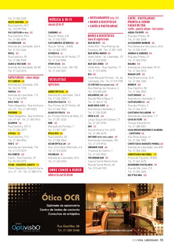 OCULISTAS opticians ANDRÉ ÓPTICAS 5 G Avenida da Liberdade, 136 A Tel. 21 326 1500 / 1 OCULISTA EXACTA 7 J Rua Portas de Stº Antão, 48 Tel. 21 342 7932 OLHAR DE PRATA 5 A Av. Fontes Pereira de Melo, 21 Tel. 21 351 3230 OMB 3 C Marquês de Pombal, 1 Tel. 21 357 1387 ÓTICA OCR 2D Rua Castilho, 50 Tel. 21 386 3046 SECOR ÓPTICA LM 4 F Rua Júlio César Machado, 4 A Tel. 21 314 0200 VISIONLAB 5 I Avenida da Liberdade, 49 A Tel. 21 342 2035