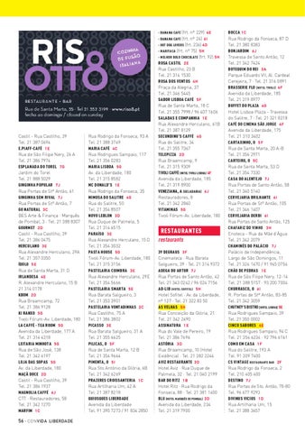 BOCCA 1 C Rua Rodrigo da Fonseca, 87 D Tel. 21 380 8383 BONJARDIM 6 J Travessa de Santo Antão, 12 Tel. 21 342 7424 BOTEQUIM DO REI 3 A Parque Eduardo VII, Al. Cardeal Cerejeira, 7 · Tel. 21 316 0891 BRASSERIE FLO [HOTEL TIVOLI] 4 F Avenida da Liberdade, 185 Tel. 21 319 8977 BUFFET DO PLAZA 4 G Hotel Lisboa Plaza - Travessa do Salitre, 7 · Tel. 21 321 8218 CAFÉ DO CINEMA SÃO JORGE 4 F Avenida da Liberdade, 175 Tel. 21 310 3402 CARTAXINHO, O 5 F Rua de Santa Marta, 20 A-B Tel. 21 356 2971 CARTEIRO, O 5 C Rua de Santa Marta, 53 D Tel. 21 354 7330 CASA DO ALENTEJO 7 J Rua Portas de Santo Antão, 58 Tel. 21 340 5140 CERVEJARIA BRILHANTE 6 I Rua Portas de Stº Antão, 105 Tel. 21 346 1407 CERVEJARIA DERBI 6 I Rua Portas de Santo Antão, 125 CHAFARIZ DO VINHO 3H Enoteca - Rua da Mãe d’Água Tel. 21 342 2079 CHAMINÉS DO PALÁCIO 7 J Palácio da Independência, Largo de São Domingos, 11 Tel. 21 324 1470 / 91 945 0754 CHÃO DE PEDRAS 1 E Rua de São Filipe Nery, 12-14 Tel. 21 388 5157 · 93 200 7004 CHURRASCO, O 6 I R. Portas de Stº Antão, 83-85 Tel. 21 342 3059 CHUTNEY’S BISTRO [HOTEL LISBOA] 5E Rua Rodrigues Sampaio, 39 Tel. 21 350 0002 CINCO SABORES 4 E Rua Rodrigues Sampaio, 94 C Tel. 21 354 6234 · 92 796 6161 COMO EM CASA 1 F Rua do Salitre, 193 A Tel. 91 309 7400 CS VINTAGE RESTAURANTE BAR 2F Rua Rodrigo da Fonseca, 2 Tel. 210 405 400 DESTINO 7 J Rua Portas de Sto. Antão, 78-80 Tel. 96 677 9293 DIVINUS VICIUS 1 D Rua Artilharia Um, 15 Tel. 21 388 3657