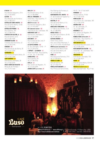 95-97 · Tel. 21 342 6609 PINÓQUIO 6 J Restauradores, 79-80 Tel. 21 346 5106 PURO ACASO 5 G Tivoli Fórum-Av. Liberdade, 180 Tel. 21 364 5190 QUEBRA-MAR 5 H Av. da Liberdade, 77 Tel. 21 346 4855 REGEDOR, O 6 J Rua Jardim do Regedor, 10 Tel. 21 347 0064 RENDEZ-VOUS COFFEE SHOP 3 F Hotel Altis - Rua Castilho, 11 Tel. 21 310 6000 RESTAURANTE 33 3 E Rua Alexandre Herculano, 33 A Tel. 21 354 6079 RESTAURANTE DO TEATRO 5 G Hotel NH · Av. Liberdade, 180 Tel. 21 351 4060 RIBADOURO 4 G Avenida da Liberdade, 155 Tel. 21 354 9411 RISO8 5 E Rua de Santa Marta, 35 A-B Tel. 21 352 3199 ROSSIO RESTAURANTE & BAR 6J Altis Avenida Hotel · Rua 1º de