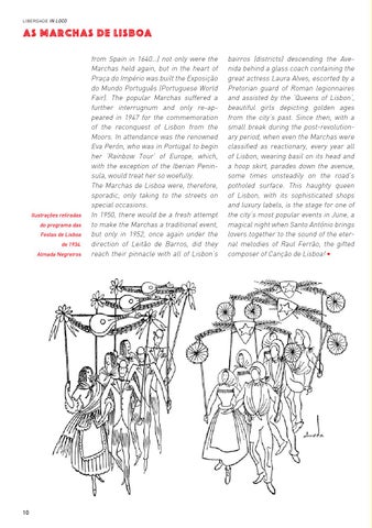 bairros (districts) descending the Avenida behind a glass coach containing the great actress Laura Alves, escorted by a Pretorian guard of Roman legionnaires and assisted by the ‘Queens of Lisbon’, beautiful girls depicting golden ages from the city’s past. Since then, with a small break during the post-revolutionary period, when even the Marchas were classified as reactionary, every year all of Lisbon, wearing basil on its head and a hoop skirt, parades down the avenue, some times unsteadily on the road’s potholed surface. This haughty queen of Lisbon, with its sophisticated shops and luxury labels, is the stage for one of the city’s most popular events in June, a magical night when Santo António brings lovers together to the sound of the eternal melodies of Raul Ferrão, the gifted composer of Canção de Lisboa! •