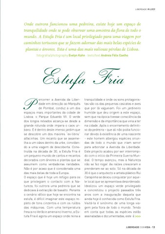 tranquilidade e onde os sons protagonistas são os das pequenas cascatas e aves que por lá vagueiam. Foi um jardineiro humilde que deu origem a este espaço, sem que na época tivesse consciência da dimensão e da importância que viria a ter na cidade. Após o encerramento definitivo da pedreira – que ali não podia funcionar devido à existência de uma nascente - este homem albergou espécies oriundas de todo o mundo que iriam servir para arborizar a Avenida da Liberdade. Este projecto acabou por ser interrompido com o início da Primeira Guerra Mundial. O tempo avançou, mas a Natureza não se fez rogar. As raízes cresceram e prenderam-se ao solo. Só na década de 30 é que o arquitecto e artista plástico Rui Carapinha se deixou conquistar por aquele local que se apresentava desordenado. Idealizou um espaço verde privilegiado e concretizou o projecto passados três anos com a inauguração daquela que ainda hoje é conhecida como Estufa Fria. Visitá-la é sinónimo de uma longa viagem pela flora de todo o mundo. Tendo em conta que todas as espécies estão assinaladas e documentadas, este é >>> liberdade con vida · 13