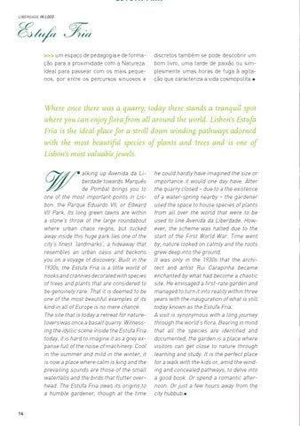 alking up Avenida da Liberdade towards Marquês de Pombal brings you to one of the most important points in Lisbon: the Parque Eduardo VII, or Edward VII Park. Its long green lawns are within a stone’s throw of the large roundabout where urban chaos reigns, but tucked away inside this huge park lies one of the city’s finest ‘landmarks’, a hideaway that resembles an urban oasis and beckons you on a voyage of discovery. Built in the 1930s, the Estufa Fria is a little world of nooks and crannies decorated with species of trees and plants that are considered to be genuinely rare. That it is deemed to be one of the most beautiful examples of its kind in all of Europe is no mere chance. The site that is today a retreat for naturelovers was once a basalt quarry. Witnessing the idyllic scene inside the Estufa Fria today, it is hard to imagine it as a grey expanse full of the noise of machinery. Cool in the summer and mild in the winter, it is now a place where calm is king and the prevailing sounds are those of the small waterfalls and the birds that flutter overhead. The Estufa Fria owes its origins to a humble gardener, though at the time 14