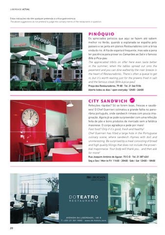 Os apreciados petiscos que aqui se fazem até sabem melhor no Verão, quando a esplanada se espalha pelo passeio e se janta em plenos Restauradores com a brisa vinda do rio. A fila de espera é frequente, mas vale a pena ter paciência para provar os Camarões ao Sal e o famoso Bife à Pica-pau. The appreciated titbits on offer here even taste better in the summer, when the tables spread out onto the pavement and you can dine wafted by the river breeze in the heart of Restauradores. There’s often a queue to get in, but it’s worth waiting just for the prawns fried in salt and the famous steak (Bife à pica-pau). Praça dos Restauradores, 79-80 · Tel. 21 346 5106 Aberto todos os dias / open everyday 12h00 - 24h00
