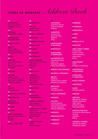 55 formação 56 fotografia 56 imobiliárias 56 livros 57 moda 58 música & hi-fi 58 oculistas 60 onde comer & beber restaurantes pronto-a-comer cafés-pastelarias snack-bares bares 66 onde dormir hotéis pensões & residenciais 68 ourivesarias & joalharias 68 papelarias & tabacarias 69 roupa interior 69 sapatarias 69 saúde produtos naturais 69 seguros 69 serviços agências de câmbios bombas de gasolina cyber stores gráficas & cópias telecomunicações 70 serviços públicos cartórios & conservatórias correios institutos polícia 71 turismo & viagens agências de viagens companhias aéreas