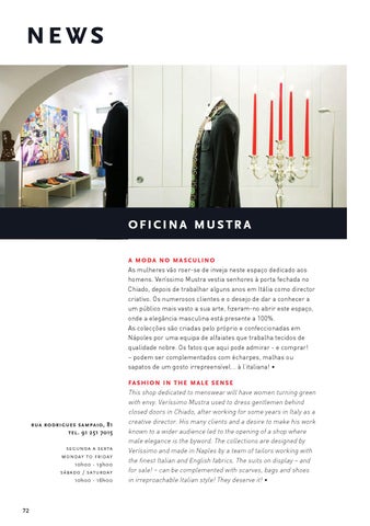 oficina mustra a moda no masculino As mulheres vão roer-se de inveja neste espaço dedicado aos homens. Veríssimo Mustra vestia senhores à porta fechada no Chiado, depois de trabalhar alguns anos em Itália como director criativo. Os numerosos clientes e o desejo de dar a conhecer a um público mais vasto a sua arte, fizeram-no abrir este espaço, onde a elegância masculina está presente a 100%. As colecções são criadas pelo próprio e confeccionadas em Nápoles por uma equipa de alfaiates que trabalha tecidos de qualidade nobre. Os fatos que aqui pode admirar - e comprar! – podem ser complementados com écharpes, malhas ou sapatos de um gosto irrepreensível... à l’italiana! •
