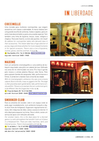 IN liberdade Coccinelle Uma morada para mulheres cosmopolitas, que exigem acessórios com classe e sobriedade. A marca italiana tem uma grande escolha de carteiras, malas e sapatos, para um estilo mais descontraído ou para uma ocasião especial. Tem também uma linha de bijuteria, lenços, luvas, relógios e chapéus. Para este Inverno, os tons são quentes. Um must! An address for cosmopolitan ladies who demand class in their accessories. This Italian label has a huge selection of purses, bags and shoes whether for more relaxed moments or for special occasions. There’s also a line of bijouterie, scarves, gloves, watches and hats. A must! il 2E
