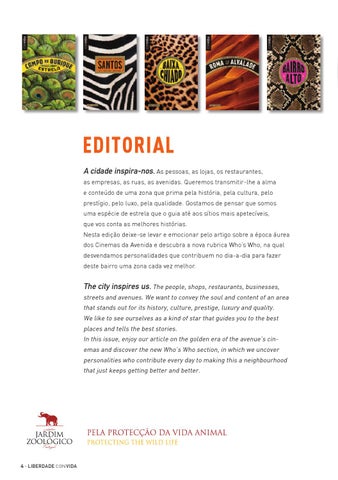 EDITORIAL A cidade inspira-nos. As pessoas, as lojas, os restaurantes, as empresas, as ruas, as avenidas. Queremos transmitir-lhe a alma e conteúdo de uma zona que prima pela história, pela cultura, pelo prestígio, pelo luxo, pela qualidade. Gostamos de pensar que somos uma espécie de estrela que o guia até aos sítios mais apetecíveis, que vos conta as melhores histórias. Nesta edição deixe-se levar e emocionar pelo artigo sobre a época áurea dos Cinemas da Avenida e descubra a nova rubrica Who’s Who, na qual desvendamos personalidades que contribuem no dia-a-dia para fazer deste bairro uma zona cada vez melhor.