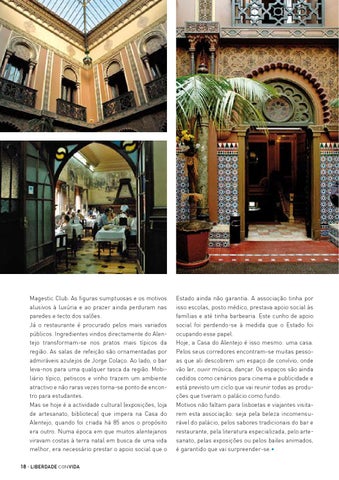 Magestic Club. As figuras sumptuosas e os motivos alusivos à luxúria e ao prazer ainda perduram nas paredes e tecto dos salões. Já o restaurante é procurado pelos mais variados públicos. Ingredientes vindos directamente do Alentejo transformam-se nos pratos mais típicos da região. As salas de refeição são ornamentadas por admiráveis azulejos de Jorge Colaço. Ao lado, o bar leva-nos para uma qualquer tasca da região. Mobiliário típico, petiscos e vinho trazem um ambiente atractivo e não raras vezes torna-se ponto de encontro para estudantes. Mas se hoje é a actividade cultural (exposições, loja de artesanato, biblioteca) que impera na Casa do Alentejo, quando foi criada há 85 anos o propósito era outro. Numa época em que muitos alentejanos viravam costas à terra natal em busca de uma vida melhor, era necessário prestar o apoio social que o 18 · LIBERDADE con vida