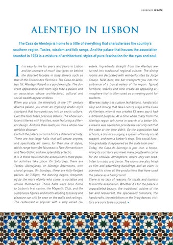 entele. Ingredients straight from the Alentejo are turned into traditional regional cuisine. The dining rooms are decorated with wonderful tiles by Jorge Colaço. Next door, the bar transports you into the ambiance of a typical eatery of the region. Typical furniture, snacks and wine create an appealing atmosphere that is often used as a meeting point for students. Whereas today it is culture (exhibitions, handicrafts shop and library) that takes centre stage at the Casa do Alentejo, when it was created 85 years ago it had a different purpose. At a time when many from the Alentejo region left home in search of a better life, a means was needed to provide the security net that the state at the time didn’t. So the association had schools, a doctor’s surgery, a system of family social support and even a barber’s shop. This social function gradually disappeared as the state took over. Today, the Casa do Alentejo is just that: a house. Along its corridors you meet many people who come for the convivial atmosphere, where they can read, listen to music and dance. The rooms are also hired as film and advertising backdrops and an event is planned to show all the productions that have used the palace as a background. There is no lack of reasons for locals and tourists to visit the association. Whether it’s for the palace’s unparalleled beauty, the traditional cuisine of the bar and restaurant, the specialised literature, the handicrafts, the exhibitions or the lively dances, visitors are sure to be surpised. •
