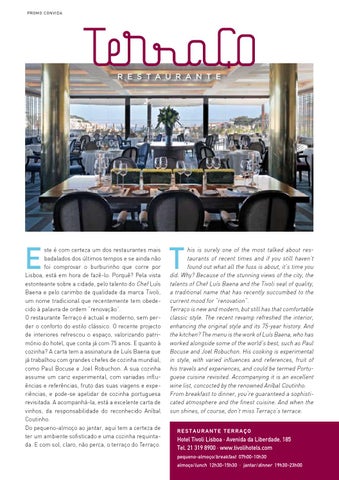 ste é com certeza um dos restaurantes mais badalados dos últimos tempos e se ainda não foi comprovar o burburinho que corre por Lisboa, está em hora de fazê-lo. Porquê? Pela vista estonteante sobre a cidade, pelo talento do Chef Luís Baena e pelo carimbo de qualidade da marca Tivoli, um nome tradicional que recentemente tem obedecido à palavra de ordem “renovação”. O restaurante Terraço é actual e moderno, sem perder o conforto do estilo clássico. O recente projecto de interiores refrescou o espaço, valorizando património do hotel, que conta já com 75 anos. E quanto à cozinha? A carta tem a assinatura de Luís Baena que já trabalhou com grandes chefes de cozinha mundial, como Paul Bocuse e Joël Robuchon. A sua cozinha assume um cariz experimental, com variadas influências e referências, fruto das suas viagens e experiências, e pode-se apelidar de cozinha portuguesa revisitada. A acompanhá-la, está a excelente carta de vinhos, da responsabilidade do reconhecido Aníbal Coutinho. Do pequeno-almoço ao jantar, aqui tem a certeza de ter um ambiente sofisticado e uma cozinha requintada. E com sol, claro, não perca, o terraço do Terraço.