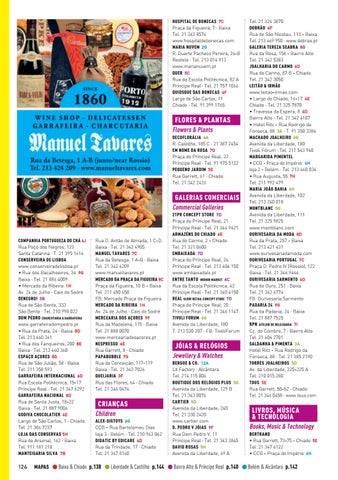 Tel. 21 324 3870 DOBRÃO 6F Rua de São Nicolau, 113 - Baixa Tel. 213 469 950 · www.dobrao.pt GALERIA TEREZA SEABRA 8G Rua da Rosa, 158 - Bairro Alto Tel. 21 342 5383 JOALHARIA DO CARMO 6D Rua do Carmo, 87 B - Chiado Tel. 21 342 3050 LEITÃO & IRMÃO www.leitao-irmao.com • Largo do Chiado, 16-17 4E Chiado · Tel. 21 325 7870 • Travessa da Espera, 8 4D Bairro Alto · Tel. 21 342 4107 • Hotel Ritz - Rua Rodrigo da Fonseca, 88 3A · T. 91 350 3384 MACHADO JOALHEIRO 6G Avenida da Liberdade, 180 Tivoli Fórum · Tel. 211 543 940 MARGARIDA PIMENTEL • CCB - Praça do Império 6H loja 2 - Belém · Tel. 213 660 034 • Rua Augusta, 55 7H Tel. 211 992 479 MARIA JOÃO BAHIA 6H Avenida da Liberdade, 102 Tel. 213 240 018 MONTBLANC 5G Avenida da Liberdade, 111 Tel. 21 325 9825 www.montblanc.com OURIVESARIA DA MODA 8D Rua da Prata, 257 - Baixa Tel. 213 421 431 www.ourivesariadamoda.com OURIVESARIA PORTUGAL 7C Praça D. Pedro IV (Rossio), 122 Baixa · Tel. 21 346 9446 OURIVESARIA SARMENTO 6D Rua do Ouro, 251 · Baixa Tel. 21 342 6774 FB: Ourivesaria Sarmento PADARIA 24 9G Rua da Padaria, 24 · Baixa Tel. 21 887 7525 RPN ATELIER DE RELOJOARIA 7I Cç. do Combro, 7 · Bairro Alto Tel. 21 604 2701 SALDANHA & PIMENTA 3A Hotel Ritz - Rua Rodrigo da Fonseca, 88 · Tel. 21 385 2190 TORRES JOALHEIROS 5D Av. da Liberdade, 225-225 A Tel. 210 015 280 TOUS 5E Rua Garrett, 50-52 · Chiado Tel. 21 346 0458 · www.tous.com