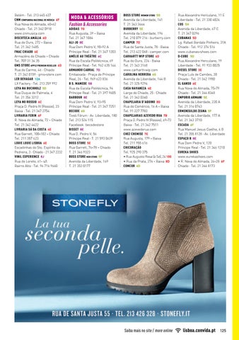 ADIDAS 7G Rua Augusta, 39 - Baixa Tel. 21 347 1084 ALI-JO 8E Rua Dom Pedro V, 90-92 A Príncipe Real · Tel. 21 347 1203 AMÉLIE AU THÉÂTRE 6C Rua da Escola Politécnica, 69 Príncipe Real · Tel. 962 635 144 ARMANDO CABRAL 7D Embaixada · Praça do Príncipe Real, 26 · Tel. 969 623 836 B S. MAMEDE 5B Rua da Escola Politécnica, 94 Príncipe Real · Tel. 21 397 9605 BARBOUR 8E Rua Dom Pedro V, 93-95 Príncipe Real · Tel. 21 347 7251 BECODE 6G Tivoli Fórum · Av. Liberdade, 180 Tel. 213 524 115 Facebook: becodestore BISSET 8E Rua D. Pedro V, 56 Príncipe Real · T. 21 593 0639 BOSS STORE 5E Rua Garrett, 76-78 - Chiado T. 21 346 9323 BOSS STORE MEN STORE 5F Avenida da Liberdade, 169 T. 21 353 0177
