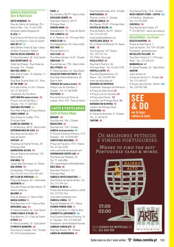 ARTIS WINEBAR 9H Rua do Diário de Notícias, 95 Bairro Alto · Tel. 21 342 4795 artisbairroalto.blogspot.pt B.LEZA 1i Rua Cintura do Porto de Lisboa, Cais da Ribeira - Cais do Sodré BAR 38º 41’ 5i Altis Belém Hotel & Spa - Doca do Bom Sucesso - Belém BAR DA VELHA SENHORA 2H R. Nova Carvalho, 38 · Cais Sodré BAR ENTRETANTO 6E Hotel do Chiado · Rua Nova do Almada, 114 · Chiado BAR SÃO JORGE 4E Altis Grand Hotel · R. Castilho, 11 BICAENSE 7J Rua Bica Duarte Belo, 42 · Bica BY THE WINE 3E Rua das Flores, 41-43 - Chiado Tel. 21 342 0319 Facebook: By The Wine CAFÉ-BAR BA BAIRRO ALTO HOTEL 3E Praça Luís de Camões, 2 Chiado · Tel. 21 340 8262 CHAFARIZ DO VINHO 4H Rua Mãe d’Água à Praça Alegria CINCO LOUNGE 6F Rua Ruben A. Leitão, 17 A Príncipe Real CLUBE DA ESQUINA 9I R. da Barroca, 30-32 · Bairro Alto ESPUMANTARIA DO CAIS 2H Rua Nova do Carvalho, 39 Cais do Sodré FOXTROT 4F Travessa de Santa Teresa, 28 Príncipe Real GARRAFEIRA ALFAIA 9H Rua do Diário de Notícias, 125 Bairro Alto GINJINHA 7B Largo São Domingos, 8 - Baixa GIN LOVERS 7D Embaixada · Príncipe Real Tel. 213 471 341 / 961 294 681 HOT CLUB DE PORTUGAL 5H Praça da Alegria, 48 - Liberdade INCÓGNITO 4I Rua dos Poiais de São Bento, 37 Santa Catarina MAJONG 8I Rua da Atalaia, 3 - Bairro Alto MARIA CAXUXA 9I Rua Barroca, 6-12 - Bairro Alto MUSICBOX LISBOA 2H R. Nova Carvalho, 24 · Cais Sodré O BOM O MAU E O VILÃO 3G Rua Alecrim, 21 - Cais do Sodré O POVO 2H R. Nova Carvalho, 32 · Cais Sodré O PURISTA BARBIÈRE 4D Rua Nova Trindade, 16C · Chiado FB: O-Purista-Barbière