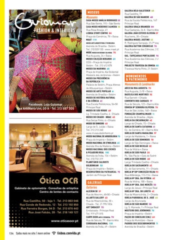 Avenida de Brasília · Belém Tel. 210 028 130 · www.maat.pt MUDE MUSEU DO DESIGN E DA MODA 7G Rua Augusta, 24 - Baixa MUSEU COLEÇÃO BERARDO 6H CCB - Praça do Império Belém · Tel. 213 612 878 MUSEU DA MARINHA 6G Praça do Império, Ala Ocidental Mosteiro dos Jerónimos - Belém MUSEU DA PRESIDÊNCIA DA REPÚBLICA 9G Palácio de Belém, Praça Afonso de Albuquerque - Belém MUSEU DE ARTE POPULAR 6i Avenida de Brasília - Belém MUSEU DE HISTÓRIA NATURAL E DA CIÊNCIA 6C Rua Escola Politécnica, 56-58 Príncipe Real MUSEU DE SÃO ROQUE 4B Lg. Trindade Coelho, 4 · Chiado MUSEU DO CHIADO - MNAC 4G Rua Serpa Pinto, 4 - Chiado MUSEU DO DINHEIRO 6G Largo de S. Julião - Baixa Tel. 213 213 240 www.museudodinheiro.pt MUSEU NACIONAL DE ARQUEOLOGIA 7G Praça do Império - Belém MUSEU NACIONAL DE ETNOLOGIA 6C Avenida Ilha da Madeira - Belém MUSEU NACIONAL DOS COCHES & PICADEIRO REAL 10G Avenida da Índia, 136 - Belém Tel. 210 732 319 PLANETÁRIO CALOUSTE GULBENKIAN 5G Praça do Império - Belém RESERVATÓRIO DA PATRIARCAL 7E Jardim do Príncipe Real