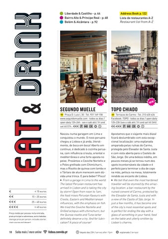 Nasceu numa garagem em Lima e conquistou o mundo. O novo peruano chegou a Lisboa e já anda, literalmente, de boca em boca! Aberto em contínuo, é dedicado à cozinha peruana, com influência crioula, oriental e mediterrânea e uma forte aposta no peixe. Provámos o Ceviche Norteño e o Polvo grelhado com Chimichurri, mas o Risotto de quinoa com lombo e o Tártaro de atum merecem sem dúvida uma trinca. E para beber? Pisco! 3 From a garage in Lima to the world. The latest Peruvian restaurant has arrived in Lisbon and is taking the city by storm! Open from noon to 1am, the food mixes Peruvian flavours with Creole, Eastern and Mediterranean influences, with the emphasis on fish. We tried the Ceviche Norteño and Grilled octopus with chimichurri, but the Quinoa risotto and Tuna tartar definitely deserve a try. And for lubrication? A pisco of course!
