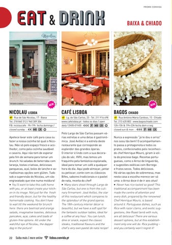 Apetece levar este café para casa ou fazer a nossa cozinha tal qual o Nicolau. Não só pelo espaço fresco e acolhedor, como pela cozinha saudável e caseira. Aqui não tem de esperar pelo fim de semana para tomar um brunch: há saladas de beterraba com laranja, tostas criativas, deliciosas panquecas, açaí, bolos de lanche e variadíssimas opções sem glúten. Tudo sob a supervisão do Nicolau, um cão engravatado que vive numa moldura! 3 You’ll want to take this café home with you, or at least create your kitchen in its image. Not just for the fresh and friendly decor, but for the healthy homemade cooking. You don’t have to wait till the weekend for brunch here: there are beetroot and orange salads, imaginative toasties, delicious pancakes, açai, cakes and loads of gluten-free options. All under the watchful eye of Nicolau, the dapper dog in the picture!