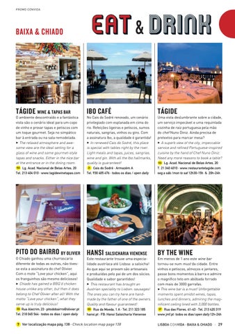 Este restaurante trouxe uma especialidade austríaca até Lisboa: a salsicha! As que aqui se provam são artesanais e produzidas pelo pai de um dos sócios. Qualidade e sabor garantidos! 3 This restaurant has brought an Austrian speciality to Lisbon: sausages! The ones you can try here are handmade by the father of one of the owners. Quality and flavour guaranteed! 0G Rua da Moeda, 1 A · Tel. 211 323 185 hansi.pt · FB: Hansi Salsicharia Vienense