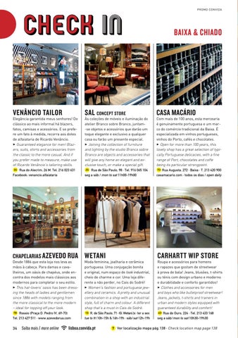 Elegância garantida meus senhores! Do clássico ao mais informal há blazers, fatos, camisas e acessórios. E se prefere um fato à medida, recorra aos dotes de alfaiataria de Ricardo Venâncio. 3 Guaranteed elegance for men! Blazers, suits, shirts and accessories from the classic to the more casual. And if you prefer made to measure, make use of Ricardo Venâncio’s tailoring skills. 3G Rua do Alecrim, 26 M. Tel. 216 023 631 Facebook: venancio.alfaiataria