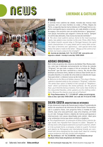 Bem vindo ao paraíso dos clássicos da Adidas! Nos Restauradores, esta loja é dedicada exclusivamente às linhas da coleção “Originals” em que todo o espaço é fiel ao conceito de “Neighbourhood” que tão bem caracteriza a marca. No rés-do-chão desfilam os famosos ténis, desde os icónicos Stan Smith aos relançados Gazelle, e no andar de cima estão as coleções de roupa. Caso para dizer: o clássico nunca sai de moda! 3 Welcome to the Mecca of Adidas classics! This shop in Restauradores is devoted solely to the company’s “Originals” collection. The whole floor space is faithful to the concept of “Neighbourhood” which summarises the brand perfectly. On the ground floor, you’ll find the famous trainers, from iconic Stan Smiths to the relaunched Gazelles, while upstairs are the clothing collections. Because the classics never go out of fashion! 6J Praça Restauradores, 72 · T. 213 460 437 · adidas.com/pt/originals todos os dias / open daily 10h00-20h00 · sex e sáb até / fri & sat till 21h00