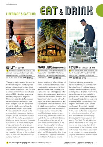 “Casual food with a twist” é o lema do Guilty, famoso pelos hambúrgueres, pizzas, massas e sobremesas feitas com o toque especial do chef. Durante a semana tem um menú executivo ao almoço (€18) e à noite é uma ótima escolha para jantares de grupo. Olivier tem o condão de fazer restaurantes com muita animação e este não é exceção: é um dos spots mais trendy da cidade, com noites onde não falta nem música nem dança! 3 “Casual food with a twist” is the motto at Guilty, famous for its hamburgers, pizzas, pastas and desserts made with the chef’s special touch. During the week, there’s an executive lunch menu (18 euros) and at night it’s a great option for large dinner parties. Olivier has a talent for opening eateries that are lively and this is no exception: it’s one of the trendiest spots in town, and there’s music and dancing included!