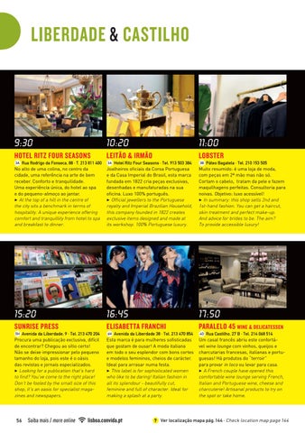 4D Rua Castilho, 27 B · Tel. 214 068 514 Um casal francês abriu este confortável wine lounge com vinhos, queijos e charcutarias francesas, italianas e portuguesas! Há produtos do “terroir” para provar in loco ou levar para casa. 3 A French couple have opened this comfortable wine lounge serving French, Italian and Portuguese wine, cheese and charcuterie! Artisanal products to try on the spot or take home.