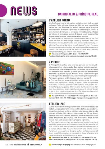 O Príncipe Real ganhou uma nova loja povoada por móveis, objetos decorativos e iluminação. Com estilos variados, aqui encontra desde estatuetas primitivas, cerâmicas, peças em vidro ou almofadas com padrões gráficos que dão um apontamento diferente a qualquer espaço. Mais há mais: fazem móveis por medida e projetos de decoração para um serviço mais completo. Para quem gosta de ambientes que fujam ao standard. 3 Príncipe Real has a new shop filled with furniture, decorative objects and lighting in a variety of styles. There are primitive statuettes, ceramics, glassware and cushions with graphic patterns that give any space a different tone. But there is more than that: they also make tailor-made furniture and do interior design projects for a more complete service. For those who like ambiances that are different from the conventional. 9F Rua Dom Pedro V, 43 · Tel. 216 059 199 · www.2pierre.pt · ter a sáb tue to sat 10h30-14h & 15h-19h30 · seg por marcação / mon by appointment