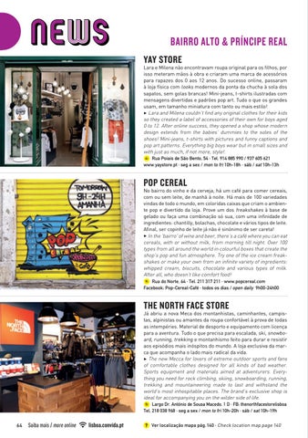 No bairro do vinho e da cerveja, há um café para comer cereais, com ou sem leite, de manhã à noite. Há mais de 100 variedades vindas de todo o mundo, em coloridas caixas que criam o ambiente pop e divertido da loja. Prove um dos freakshakes à base de gelado ou faça uma combinação só sua, com uma infinidade de ingredientes: chantilly, bolachas, chocolate e vários tipos de leite. Afinal, ser copinho de leite já não é sinónimo de ser careta! 3 In the 'bairro' of wine and beer, there’s a café where you can eat cereals, with or without milk, from morning till night. Over 100 types from all around the world in colourful boxes that create the shop’s pop and fun atmosphere. Try one of the ice cream freakshakes or make your own from an infinite variety of ingredients: whipped cream, biscuits, chocolate and various types of milk. After all, who doesn’t like comfort food! 9i Rua do Norte, 64 · Tel. 211 317 211 · www.popcereal.com Facebook: Pop-Cereal-Café · todos os dias / open daily 9h00-24h00