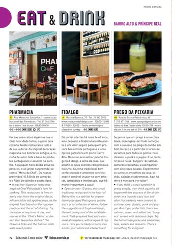 De portas abertas há mais de 40 anos, este pequeno e tradicional restaurante é um valor seguro para quem procura boa comida portuguesa e uma óptima garrafeira em pleno Bairro Alto. Deixe-se aconselhar pelo Sr. Eugénio Fidalgo, a alma da casa, que acolhe os seus clientes com profissionalismo. Cozinha tradicional bem confeccionada e ambiente convivial onde é provável cruzar-se com artistas, jornalistas e intelectuais, que há muito frequentam a casa! 3 Open for over 40 years, this small traditional restaurant in the heart of Bairro Alto is a safe bet for anyone looking for good Portuguese cuisine and a great selection of wines. Follow the suggestions of Eugénio Fidalgo, the welcoming soul of the establishment. Well-prepared food and a convivial atmosphere, with a legion of regulars. Here you’re likely to bump into artists, journalists and intellectuals!