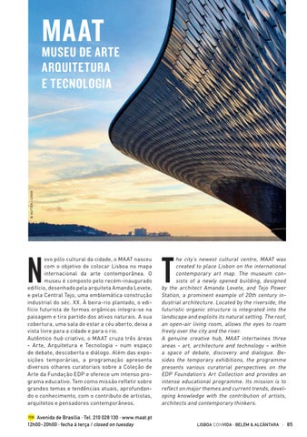 ovo pólo cultural da cidade, o MAAT nasceu com o objetivo de colocar Lisboa no mapa internacional da arte contemporânea. O museu é composto pelo recém-inaugurado edifício, desenhado pela arquiteta Amanda Levete, e pela Central Tejo, uma emblemática construção industrial do séc. XX. À beira-rio plantado, o edifício futurista de formas orgânicas integra-se na paisagem e tira partido dos ativos naturais. A sua cobertura, uma sala de estar a céu aberto, deixa a vista livre para a cidade e para o rio. Autêntico hub criativo, o MAAT cruza três áreas - Arte, Arquitetura e Tecnologia - num espaço de debate, descoberta e diálogo. Além das exposições temporárias, a programação apresenta diversos olhares curatoriais sobre a Coleção de Arte da Fundação EDP e oferece um intenso programa educativo. Tem como missão refletir sobre grandes temas e tendências atuais, aprofundando o conhecimento, com o contributo de artistas, arquitetos e pensadores contemporâneos. 11H Avenida de Brasília · Tel. 210 028 130 · www.maat.pt 12h00 -20h00 · fecha à terça / closed on tuesday