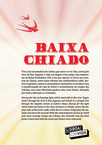 BAIXA CHIADO Viva a luz encantadora de Lisboa que nasce no rio Tejo, entra pelo Arco da Rua Augusta e viaja em ângulo recto pelas ruas majestosas da Baixa Pombalina. Viva a luz que aquece os livros nas montras do Chiado, entra pelas vitrines dos emblemáticos cafés, derrete os gelados, anima os estudantes e deslumbra os turistas! Com a transformação do Cais do Sodré e recentemente do Campo das Cebolas, esta zona ribeirinha ganhou uma nova tónica, abraçada por todos, lisboetas ou visitantes. Hooray for the enchanting light which starts life in the river Tagus, enters through the Arch in Rua Augusta and travels in a straight line through the majestic streets of Lisbon’s Baixa. Hooray for the light which heats the books in the shop windows in Chiado, enters the display cases of the iconic cafés, melts the ice creams, invigorates the students and stuns the tourists! With the redevelopment of Cais do Sodré and, more recently, Campo das Cebolas, this riverside area has been given a boost that both the locals and visitors have embraced.