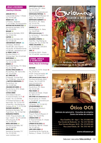 JÓIAS & RELÓGIOS Jewellery & Watches ANSELMO 1910 4E Largo de São Carlos, 1 · Chiado Tel. 917 772 385 BERGUE & CO. 12A LX Factory · Alcântara T. 214 115 006 · FB: bergueandco BOUTIQUE DOS RELÓGIOS PLUS 5G Avenida da Liberdade, 129 B Tel. 213 430 076 BULGARI 5D Avenida da Liberdade, 238 B Tel. 213 861 594 CARTIER 5D Avenida da Liberdade, 240 Tel. 213 302 420 CONTEMPORARY JEWELRY 12A LX Factory · Alcântara 932 047 200 · www.misari.fr 915 244 096 · IG: Géraldine Grinda 912 502 403 · valerielachuer.com D. PEDRO V JÓIAS 9F Rua Dom Pedro V, 11 Príncipe Real · Tel. 213 433 845 DAVID ROSAS 5H Avenida da Liberdade, 69 A Tel. 213 243 870 DOBRÃO 6F Rua de São Nicolau, 113 · Baixa Tel. 213 469 950 GALERIA TEREZA SEABRA 8G Rua da Rosa, 158 · Bairro Alto Tel. 213 425 383 HLC JEWELLERY 7D Embaixada · Príncipe Real Tel. 912 052 061 · www.hlc.pt J. BAPTISTA OURIVESARIA 7E Rua do Ouro, 166 Tel. 213 859 068 JOALHARIA DO CARMO 6D Rua do Carmo, 87 B · Chiado Tel. 213 423 050 LEITÃO & IRMÃO www.leitao-irmao.com • Largo do Chiado, 16-17 4E Chiado · Tel. 213 257 870 • Travessa da Espera, 8 4D Bairro Alto · Tel. 213 424 107 • Hotel Ritz - Rua Rodrigo da Fonseca, 88 3A · T. 211 923 454 MACHADO JOALHEIRO 6G Avenida da Liberdade, 180 Tivoli Fórum · Tel. 211 543 940 MARGARIDA PIMENTEL • CCB - Praça do Império 6H loja 2 · Belém · Tel. 213 660 034 • Rua Augusta, 55 7H Tel. 211 992 479 MARIA JOÃO BAHIA 6H Avenida da Liberdade, 102 Tel. 213 240 018 MONTBLANC 5G Avenida da Liberdade, 111 Tel. 213 259 825 www.montblanc.com