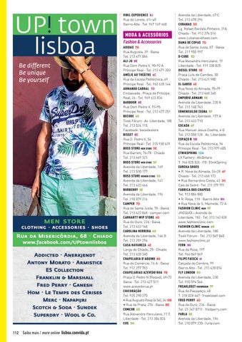 Avenida da Liberdade, 67 C Tel. 213 470 296 CUBANAS 5D Lg. Rafael Bordalo Pinheiro, 31A Chiado · Tel. 912 374 516 www.cubanas-shoes.com DAMA DE COPAS 7D Rua de Santa Justa, 87 · Baixa Tel. 211 955 997 D-CUBE 5D Rua Alexandre Herculano, 19 Liberdade · Tel. 919 330 025 DIESEL STORE 3E Praça Luís de Camões, 30 Chiado · Tel. 213 421 980 EL GANSO 6E Rua Nova do Almada, 75-79 Chiado · Tel. 213 468 348 EMPORIO ARMANI 5E Avenida da Liberdade, 220 A Tel. 213 140 743 ERMENEGILDO ZEGNA 5F Avenida da Liberdade, 177 A Tel. 213 433 710 ESCADA 6F Rua Manuel Jesus Coelho, 4 B Tel. 213 558 128 · Av. Liberdade ESPAÇO B 5B Rua da Escola Politécnica, 94 Príncipe Real · Tel. 213 979 605 ETNIKSPRING 12A LX Factory · Alcântara T. 964 825 526 · FB: EtnikSpring EUREKA SHOES • R. Nova do Almada, 26-28 6F Chiado · Tel. 213 468 173 • Rua Bernardino Costa, 43 3H Cais do Sodré · Tel. 211 379 771 FÁBRICA DOS CHAPÉUS Tel. 913 086 880 • R. Rosa, 118 · Bairro Alto 8H • Rua Nova de S. Mamede, 72 A FASHION CLINIC MAN 5F JNCQUOI - Avenida da Liberdade, 182 · Tel. 213 142 828 www.fashionclinic.com FASHION CLINIC WOMAN 6G Avenida da Liberdade, 180 Tivoli Fórum · Tel. 213 549 040 www.fashionclinic.pt FERN 8G Rua da Rosa, 197 Tel. 966 849 869 FILIPE FAÍSCA 6I Calçada do Combro, 99 Bairro Alto · Tel. 213 420 014 FLY LONDON 5D Avenida da Liberdade, 230 Tel. 910 594 564 FREAKLOSET SHOWROOM 7F Rua do Passadiço, 68 T. 218 028 447 · freakloset.com FRED PERRY 6D Rua do Ouro, 234 · Baixa Tel. 21 347 0711 · fredperry.com FURLA 5E Avenida da Liberdade, 196 Tel. 210 079 230 · furla.com