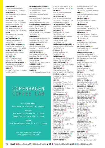 • Rua de Santa Marta, 35 6D • Rua de Belém, 116-118 8G IBO MAR 2i Cais do Sodré, Armazém A Tel. 929 308 068 IBO RESTAURANTE 2i Cais do Sodré, Armazém A Tel. 213 423 611 / 961 332 024 www.ibo-restaurante.pt JNCQUOI RESTAURANTE & DELIBAR 6F Avenida da Liberdade, 182 Tel. 219 369 900 KAFFEEHAUS 5F Rua Anchieta, 3 · Chiado Tel. 210 956 828 www.kaffeehaus-lisboa.com KOB BY OLIVIER 3E Rua do Salitre, 169 A Tel. 934 000 949 LA BRASSERIE DE L’ENTRECÔTE 3E Rua do Alecrim, 117 - Chiado Tel. 213 473 616 L’ANISETTE 3i Rua de São Bento, 30 Tel. 210 736 786 LA PARISIENNE 5D Lg. Rafael Bordalo Pinheiro, 18 Chiado · Tel. 964 203 947 LARGO RESTAURANTE 4F Rua Serpa Pinto, 10 A · Chiado Tel. 213 477 225 LAS FICHERAS 2H Rua dos Remolares, 34 Cais do Sodré · Tel. 213 470 553 L’ATELIER PORTO 7J Travessa da Portuguesa, 38 A Tel. 211 395 935 LESS 7D Embaixada · Príncipe Real Tel. 924 038 218 · ginlovers.pt LISBOA À NOITE 9i Rua das Gáveas, 69 · Bairro Alto Tel. 213 468 557 www.lisboanoite.com LOB LOBSTER & SECRETS 4D Rua da Misericórdia, 93 Tel. 215 987 801 e 914 303 635 LOST IN ESPLANADA-BAR 8E Rua Dom Pedro V, 58 Príncipe Real · Tel. 917 759 282 MERCADO DA RIBEIRA TIME OUT 1H Av. 24 de Julho · Cais do Sodré MESÓN ANDALUZ 3G Travessa do Alecrim, 4 · Chiado Tel. 214 600 659 MINI BAR 4F Rua António Maria Cardoso, 58 Chiado · Tel. 211 305 393 MOMA GRILL 7F Rua dos Correeiros, 22 · Baixa Tel. 911 762 349 NOOBAI CAFÉ 6J Miradouro do Adamastor Santa Catarina · Tel. 213 465 014 NUNES REAL MARISQUEIRA 4H Rua Bartolomeu Dias, 112 Belém · Tel. 213 019 899 OLIVIER AVENIDA 5F