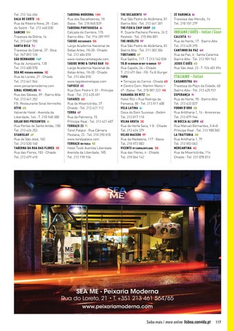 Tel. 213 144 656 SALA DE CORTE 1G Rua da Ribeira Nova, 28 · Cais do Sodré · Tel. 213 460 030 SANCHO 5H Travessa da Glória, 14 Tel. 213 469 780 SANTA BICA 7J Travessa do Cabral, 37 · Bica Tel. 967 092 128 SÃO BERNARDO 14F Rua da Junqueira, 120 Tel. 213 600 570 SEA ME PEIXARIA MODERNA 3E Rua do Loreto, 21 · Chiado Tel. 213 461 564 www.peixariamoderna.com SINAL VERMELHO 9i Rua das Gáveas, 89 · Bairro Alto Tel. 213 461 252 FB: Restaurante Sinal Vermelho SÍTIO 6G Valverde Hotel · Avenida da Liberdade, 164 · T. 210 940 300 SOLAR DOS PRESUNTOS 6i Rua Portas de Santo Antão, 150 Tel. 213 424 253 STANISLAV 6F Rua de São José, 182 Tel. 213 530 140 TABERNA DA RUA DAS FLORES 3E Rua das Flores, 103 · Chiado Tel. 213 479 418