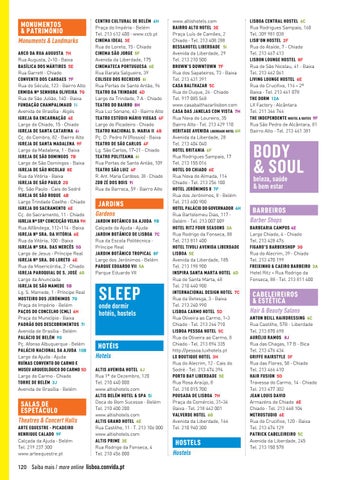 www.altishotels.com BAIRRO ALTO HOTEL 3E Praça Luís de Camões, 2 Chiado · Tel. 213 408 288 BESSAHOTEL LIBERDADE 5i Avenida da Liberdade, 29 Tel. 213 210 500 BROWN’S DOWNTOWN 7F Rua dos Sapateiros, 73 · Baixa Tel. 213 431 391 CASA BALTHAZAR 5C Rua do Duque, 26 · Chiado Tel. 917 085 568 www.casabalthazarlisbon.com CASA DAS JANELAS COM VISTA 7H Rua Nova do Loureiro, 35 Bairro Alto · Tel. 213 429 110 HERITAGE AVENIDA LIBERDADE HOTEL 6H Avenida da Liberdade, 28 Tel. 213 404 040 HOTEL BRITANIA 6F Rua Rodrigues Sampaio, 17 Tel. 213 155 016 HOTEL DO CHIADO 6E Rua Nova do Almada, 114 Chiado · Tel. 213 256 100 HOTEL JERÓNIMOS 8 7F Rua dos Jerónimos, 8 · Belém Tel. 213 600 900 HOTEL PALÁCIO DO GOVERNADOR 4H Rua Bartolomeu Dias, 117 · Belém · Tel. 213 007 009 HOTEL RITZ FOUR SEASONS 3A Rua Rodrigo da Fonseca, 88 Tel. 213 811 400 HOTEL TIVOLI AVENIDA LIBERDADE LISBOA 5E Avenida da Liberdade, 185 Tel. 213 198 900 INSPIRA SANTA MARTA HOTEL 6D Rua de Santa Marta, 48 Tel. 210 440 900 INTERNACIONAL DESIGN HOTEL 7C Rua da Betesga, 3 · Baixa Tel. 213 240 990 LISBOA CARMO HOTEL 5D Rua Oliveira ao Carmo, 1-3 Chiado · Tel. 213 264 710 LISBOA PESSOA HOTEL 5C Rua da Oliveira ao Carmo, 8 Chiado · Tel. 213 894 335 http://pessoa.luxhotels.pt LX BOUTIQUE HOTEL 3H Rua do Alecrim, 12 · Cais do Sodré · Tel. 213 474 394 PORTO BAY LIBERDADE 5E Rua Rosa Araújo, 8 Tel. 210 015 700 POUSADA DE LISBOA 7H Praça do Comércio, 31-34 Baixa · Tel. 218 442 001 VALVERDE HOTEL 6G Avenida da Liberdade, 164 Tel. 210 940 300